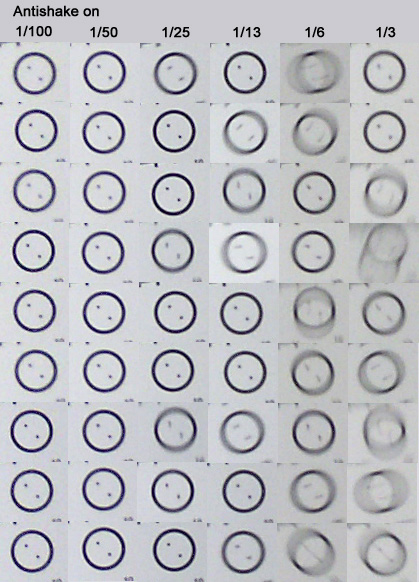 - 1/13 sec shutter speed with AS on results in more frequent blurring than 1/100 sec and AS off